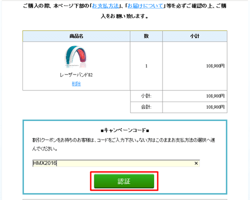 定価の金額が表示されているのでキャンペーンコード内へクーポンコード「HMX2016」を入力する。